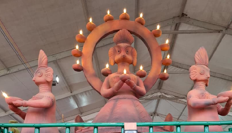 At the centre of the tableau is a striking terracotta installation featuring a towering doll holding earthen lamps arranged in a circular formation, symbolising continuity, light and the enduring legacy of Assam’s indigenous crafts.