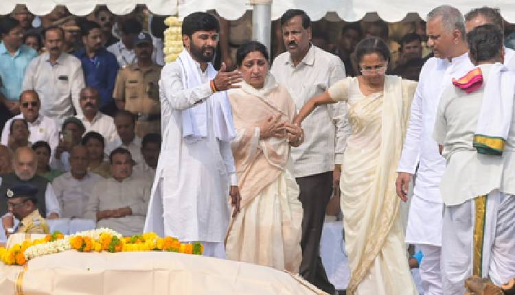 Earlier in the day, his mortal remains were kept at his residence in Katewadi, where a massive influx of people from across the state arrived to pay their respects.