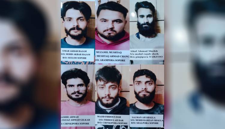 The individuals have been identified as Umar Akbar Hajam, son of Mohammad Akbar and resident of Seelu village in Baramulla; Salman Ahmed Shala, son of Mohammad Ramzan Shala and resident of Shalpora area in Sopore; Altaf Ahmed Sheikh, son of Mohammad Rajab Sheikh and resident of Panzipora Tarzoo village in Sopore; Mubashir Ahmed Gilkar, son of Fayaz Ahmed Gilkar and resident of Naseerabad area in Sopore; Muzammil Mushtaq Changa, son of Mushtaq Ahmed Changa and resident of Arampora village in Sopore; and Majid Firdous Dar, son of Firdous Ahmed Dar and resident of Chinkipora area in Sopore.