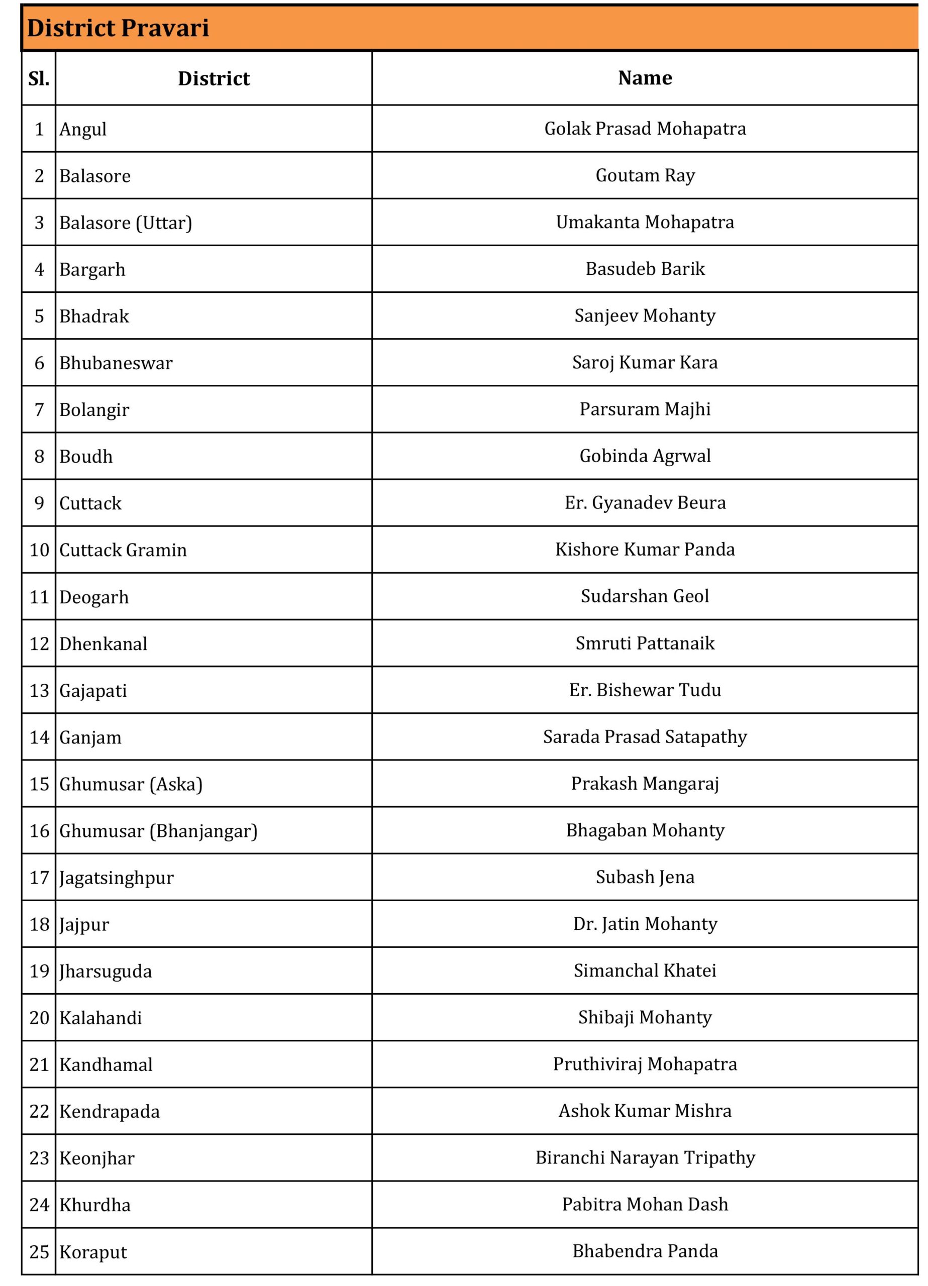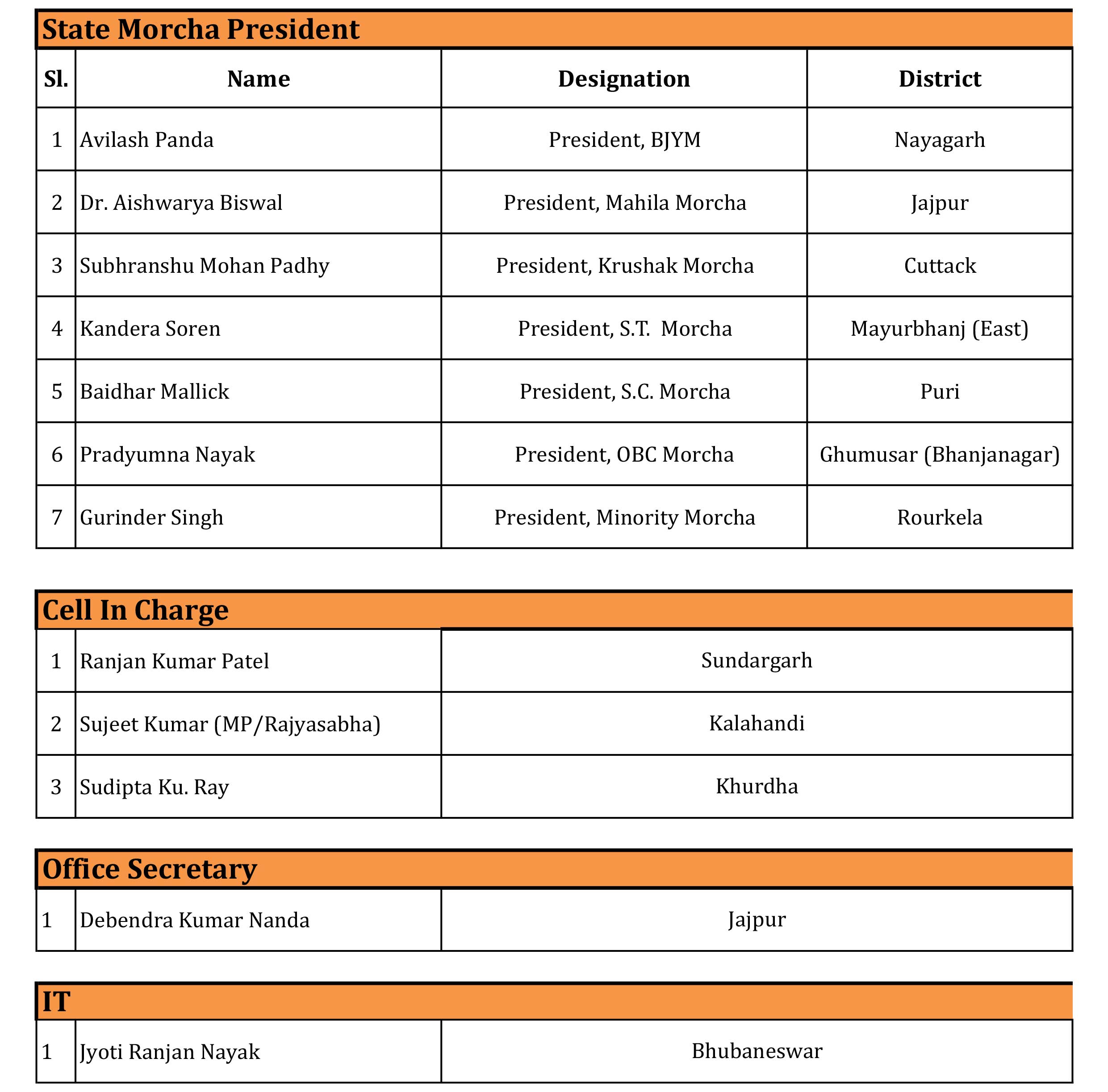 The state BJP president, Manmohan Samal, has approved the appointments, which include 7 Morcha Presidents, 3 BJP Cell In-Charges, 1 Office Secretary, 1 IT In-Charge, and 37 District Prabharis.