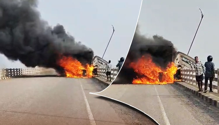 Jharsuguda: A coal-laden truck met with a major accident on Saturday after losing balance on the Rampela Bridge under the jurisdiction of Banaharpali police station in Jharsuguda district. The truck crashed into the side wall of the bridge, following which a fire broke out in its engine and rapidly spread, engulfing the entire vehicle.