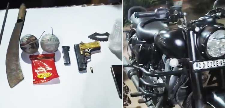 According to police, a patrolling team intercepted the suspects while they were allegedly planning a robbery in the area. During the search, police recovered one country-made pistol with live ammunition, two country-made bombs, a sword, an iron rod, a cutter, a chain, brass knuckles, chilli powder, a motorcycle, and two liquor bottles from their possession.