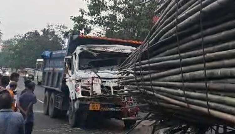 Bhubaneswar: In a shocking incident early Sunday morning, a sand-laden truck rammed violently into the rear of a bamboo-loaded truck near Kalyan Mandap in Chandrasekharpur in Bhubaneswar.