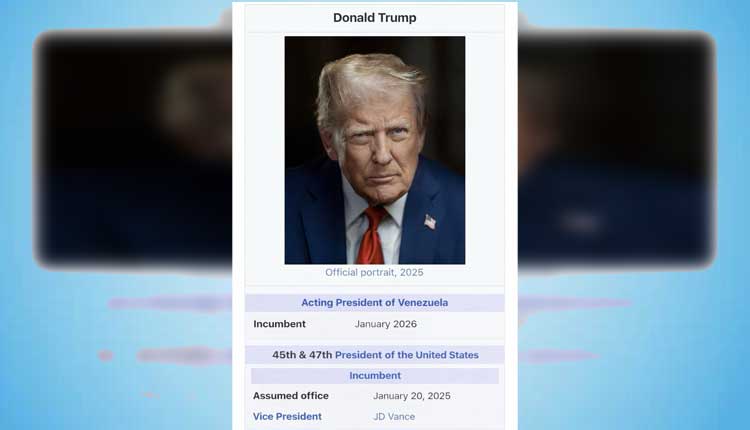 The photo seemed to be of an edited Wikipedia page, where Trump is shown as the ‘incumbent Venezuelan president’ as of January 2026. It also mentions his actual official posts — the 45th and 47th President of the United States.